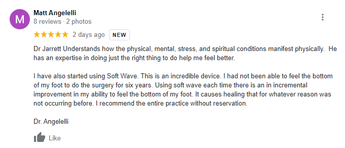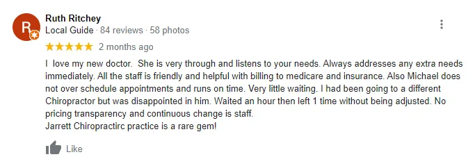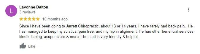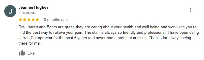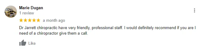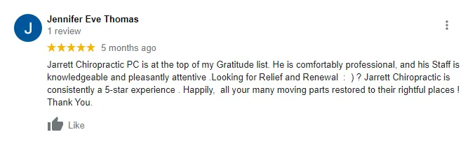 Disclaimer: Procedures and treatments performed by Jarrett Chiropractic have an inherent success (and failure) rate. Reviews, testimonials and content on this site should not be interpreted as a statement of efficacy of procedures and treatments performed by Jarrett Chiropractic for anyone else.